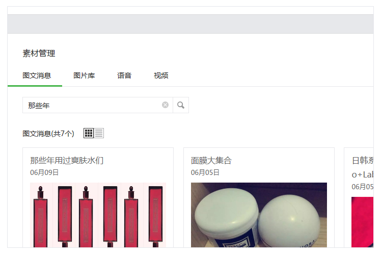 除用戶管理的搜索功能外,素材庫圖文消息和消息管理的搜索功能體驗上保持一致,輸入框內提示已支持的搜索內容。