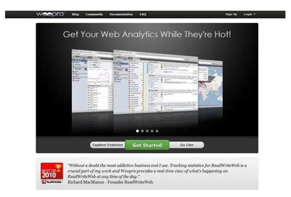 Woopra的出現(xiàn)將實(shí)時(shí)統(tǒng)計(jì)帶到了另一個(gè)層次,它能實(shí)時(shí)直播網(wǎng)站的訪問數(shù)據(jù),你甚至可以使用Woopra Chat部件與用戶聊天。不僅如此,另外,Woopra還擁有先進(jìn)的通知功能,可讓你建立各類通知,如:電子郵件、聲音、彈出框等。
