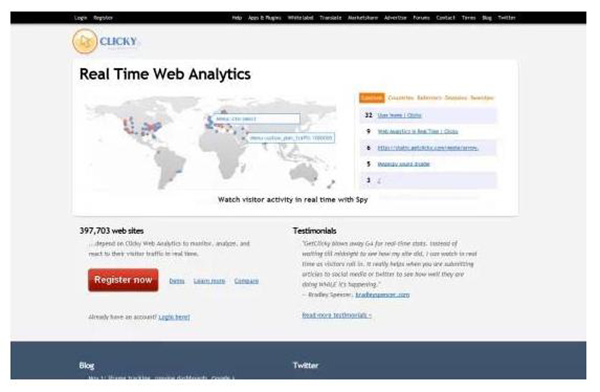 Google Analytics是一個(gè)使用非常廣泛的訪問統(tǒng)計(jì)工具,目前它推出了一系列的新的功能,可以提供實(shí)時(shí)報(bào)告。你可以看到你的網(wǎng)站中目前在線的訪客數(shù)量,了解他們觀看了哪些網(wǎng)頁、他們通過哪個(gè)網(wǎng)站鏈接到你的網(wǎng)站、來自哪個(gè)國家......。