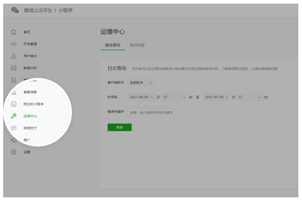 為了幫助開(kāi)發(fā)者及時(shí)發(fā)現(xiàn)小程序運(yùn)行中出現(xiàn)的問(wèn)題,公眾平臺(tái)新增小程序運(yùn)維中心。開(kāi)發(fā)者可以在運(yùn)維中心查詢(xún)小程序最近30天內(nèi)出現(xiàn)的錯(cuò)誤信息,快速修復(fù)問(wèn)題。