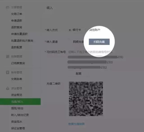 電腦登錄微信支付商戶平臺-交易中心 - 充值轉入,選擇轉入方式為“掃碼充值”,根據頁面操作流程進行充值;