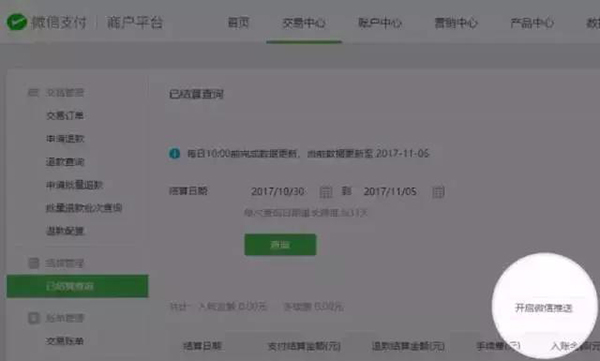 為及時接收到每日交易款結算提現情況的通知,商戶可以通過電腦登錄微信支付商戶平臺-交易中心-已結算查詢,點擊“開啟微信推送”,根據頁面操作流程開通每日交易款結算情況通知功能;開通后,將于每日早上10點前通過微信支付商戶助手公眾號接收到前一日結算情況,以及結算款自動提現進展。