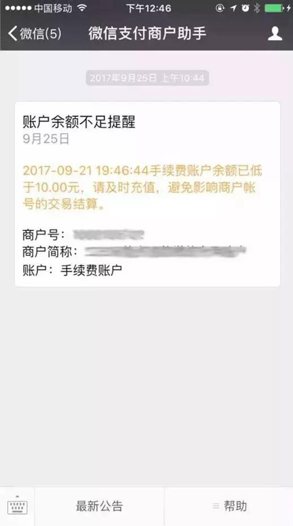當手續費賬戶余額低于設置金額時,會通過微信支付商戶助手公眾號下發賬戶余額不足提醒;