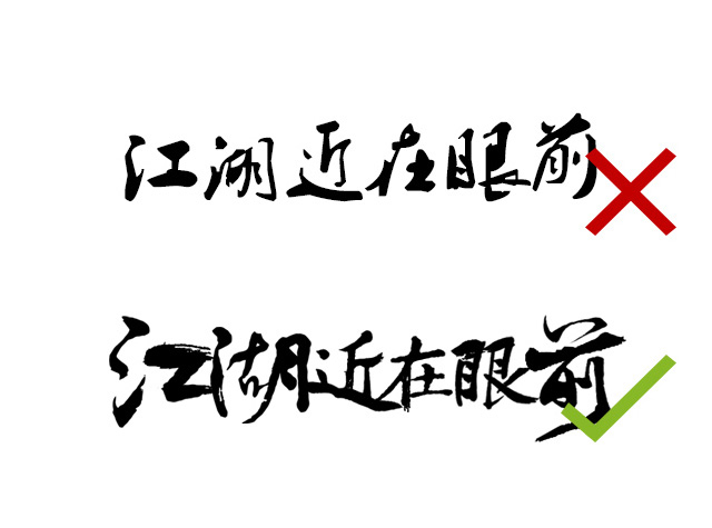 錯(cuò)誤的示意里我們選用了一款常用的書法字體,當(dāng)然結(jié)果是不理想的,也許項(xiàng)目會(huì)反饋你不夠大氣,無論在筆觸上,字形上都不是一個(gè)很好的選擇,但是現(xiàn)有的字體無法滿足你的要求,怎么辦,你可以利用一些在線書法生成一些毛筆字,但是要注意的是生成的很多字在筆觸粗細(xì)上都不一樣,很容易讓你幾個(gè)字放在一起看著很別捏,如果你沒有很好的書法基礎(chǔ),你需要多下載一些書法筆觸,找出一些字特點(diǎn)并移植到你選中的另外幾個(gè)字上,在適當(dāng)?shù)牡胤郊哟止P觸,這也是一個(gè)慢慢磨的過程,但是能提高不少作品的品質(zhì)感!