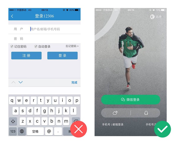 美學在設計產品的使用上扮演著重要的角色。美的設計能促進人們形成正面積極的態度,而且讓人們對產品設計上的缺陷更具有包容性。如:同樣都是登錄頁面我們更容易接受右面的設計,并且我們會通過是否美觀推斷右面的APP應該更好用,畢竟一個好用的APP應該都會好好“打扮”一下吧!