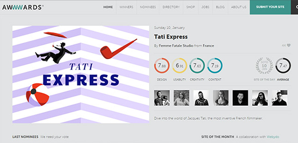 Awwwards不只是一個展示網頁設計的網站,它邀請一些有地位的設計師、博客和機構組成一個多學科的評審小組對設計師的網頁設計進行評分,大家可以查看獲獎者及被提名人的作品,Awwwards也會舉辦會議來嘉獎那些對網頁設計做出貢獻的獲獎者,它也會幫助相關機構發布招聘信息。與此同時,Awwwards還擁有自己的網上商店用于售賣網頁設計相關書籍。