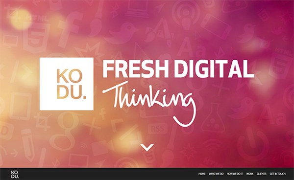 KODU的網(wǎng)頁(yè)設(shè)計(jì)除了漸變的背景圖片以外,還使用了一些炫光效果,亮麗的枚紅主色令網(wǎng)站變得格外清新樂觀。背景上的水印底紋設(shè)計(jì)也讓頁(yè)面不那么單調(diào),并且很好的體現(xiàn)了網(wǎng)站特色。