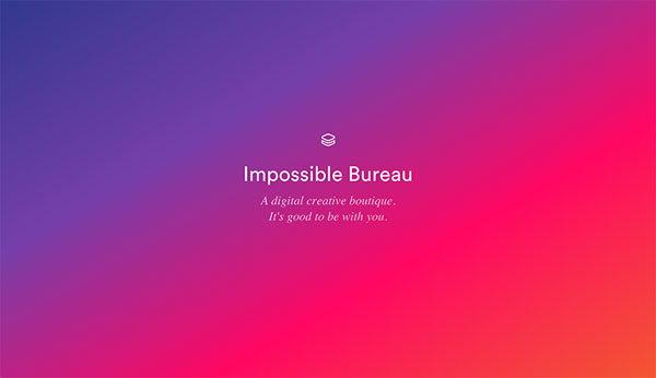 Impossible Bureau的頁(yè)面采用了非常鮮明、反差強(qiáng)烈的漸變色!很酷的是,每當(dāng)頁(yè)面加載完成,其他元素在上方出現(xiàn),頁(yè)面的濃烈與戲劇性并沒有被沖淡。