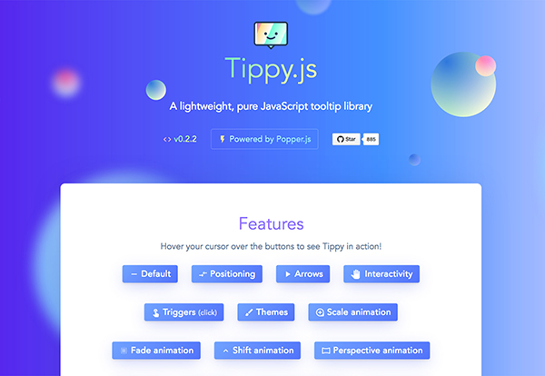 Tippy是一款輕量級的純JS工具提示庫,其中包含了大量不同的交互相關(guān)的提示內(nèi)容,它的出現(xiàn)對設(shè)計師的工作有很大的幫助,并且它的兼容性非常的好,幾乎可以適用于任何瀏覽器,這也使得它幾乎可以輕松實現(xiàn)各種各樣的提示效果。