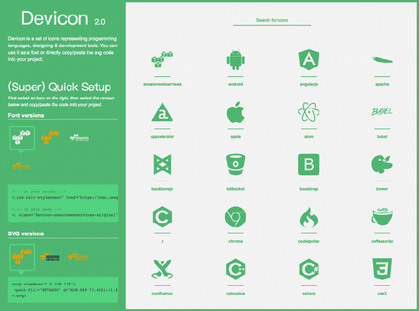 Devicon主要是以收錄程式語言、設計和開發工具為主,常見的技術相關標志圖標都可在這個網站中找到。Devicon 提供兩種使用方式:字體圖標或 SVG 向量圖格式,只要從網站上找到你要的圖案,直接將產生的代碼復制、貼上,就能快速取用圖案。