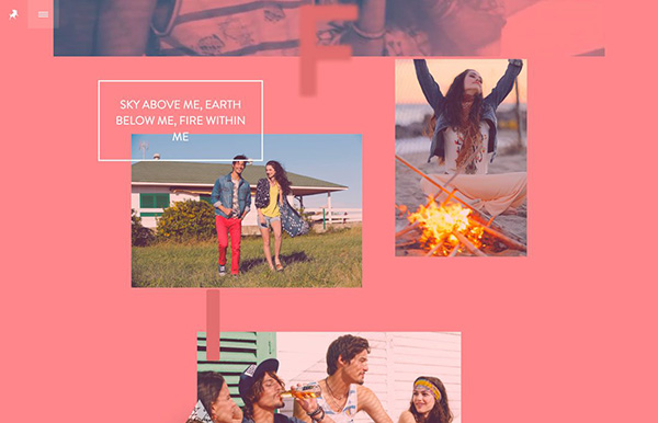 不過,Lois Jeans網(wǎng)頁則采用了另外一種搭配方式,設(shè)計(jì)師用不同的色彩來凸顯不同的活動(dòng)和不同的主題,隨著頁面滾動(dòng),背景的顏色隨之變化,和前景滾動(dòng)變化的圖片相搭配。