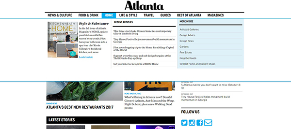 如:Atlanta Magazine這個網站的大型導航菜單給人的體驗就非常流暢,下拉菜單中嵌入了大量的鏈接,另外由于響應式的滑動導航在移動端上也已經很常見了,這使得它還輕松兼顧到了移動端的設計。
